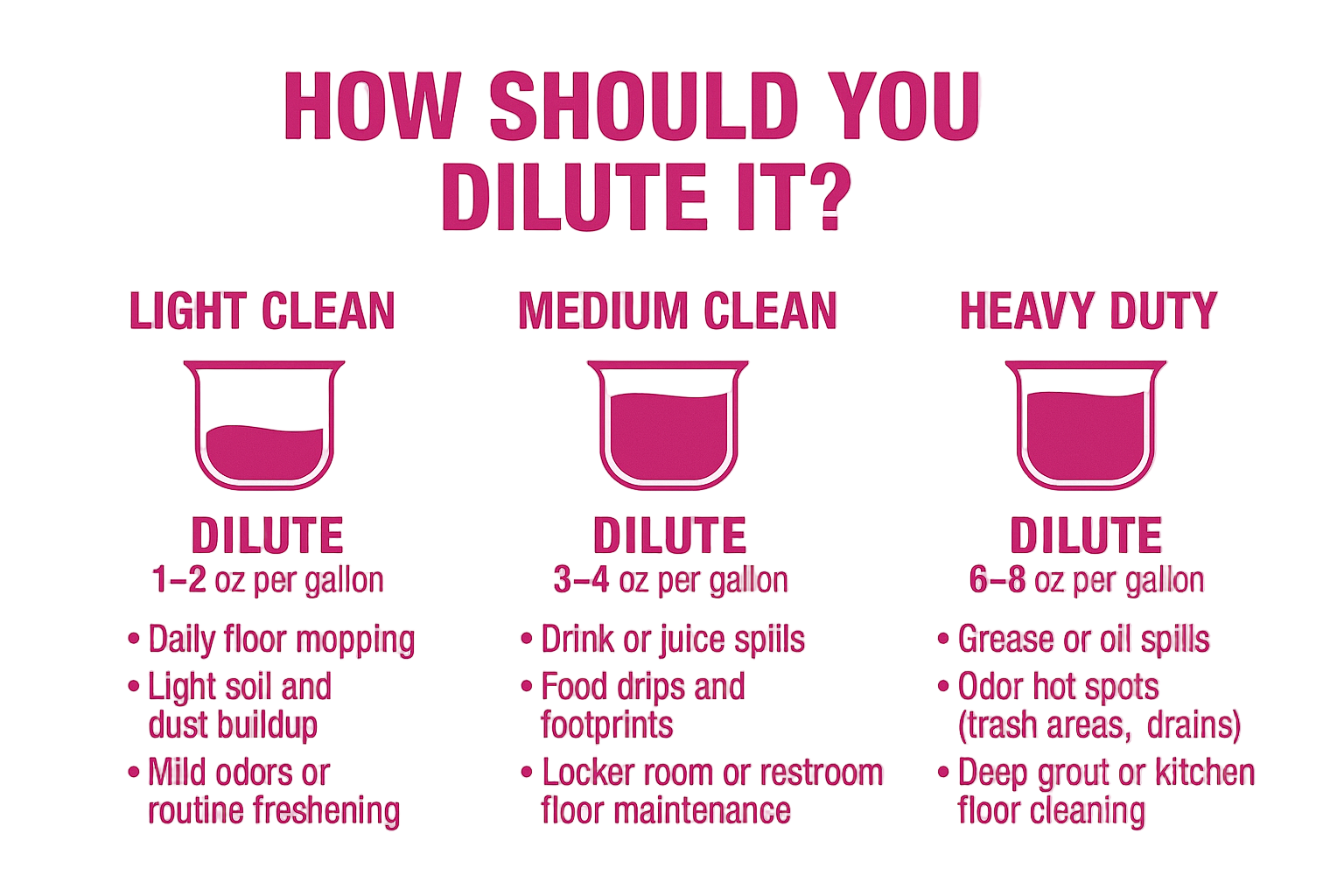 | Medium Cleaning | 3–4 oz per gallon | 8–10.6 gallons | 8–10.6 gallons RTU |